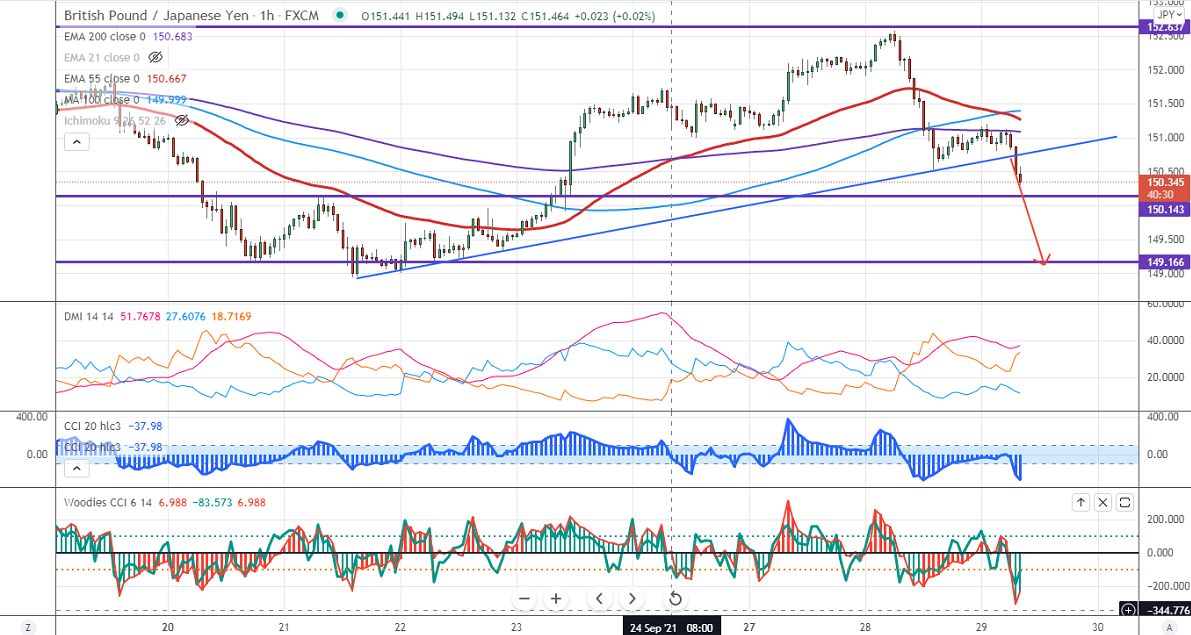 GBPJPY continues to trade weak and lost more than 200 pips on board-based pound sterling selling. The pound sterling is trading below 1.3600 levels against the US dollar on Brexit concerns and the fuel crisis in the UK. The surge in US treasury yield after Janet Yellen comments on the debt ceiling also supporting the US dollar at lower levels. GBPJPY hits an intraday low of 150.495 and is currently trading around 150.48. The intraday trend of GBPJPY is as long as support 150.69 holds.