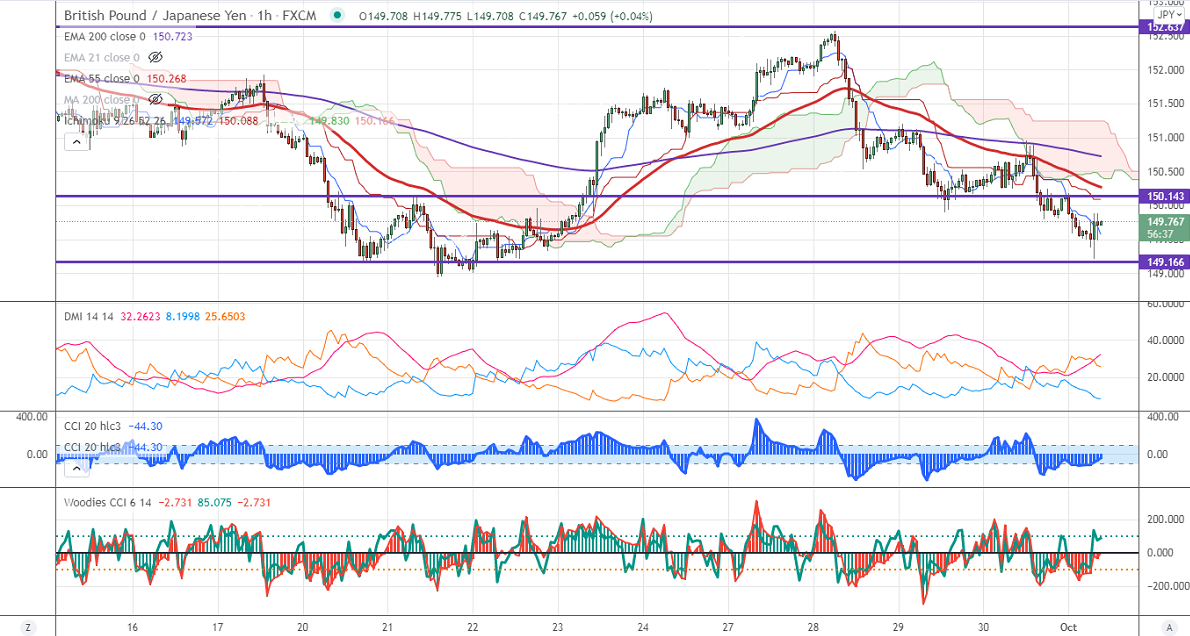 GBPJPY is trading weak for the fourth consecutive day and lost more than 200 Pips on board-based Pound sterling selling. The pound sterling was one of the worst performers this week against the US dollar on the petrol crisis in the UK. GBPUSD hits a multi-month low of 1.3415 despite better than expected UK GPD data. It came at 5.5% for the second quarter against the forecast of 4.8%.GPJPY hits an intraday low of 149.22 and is currently trading around 1. The intraday trend of GBPJPY is bearish as long as resistance 151 holds.