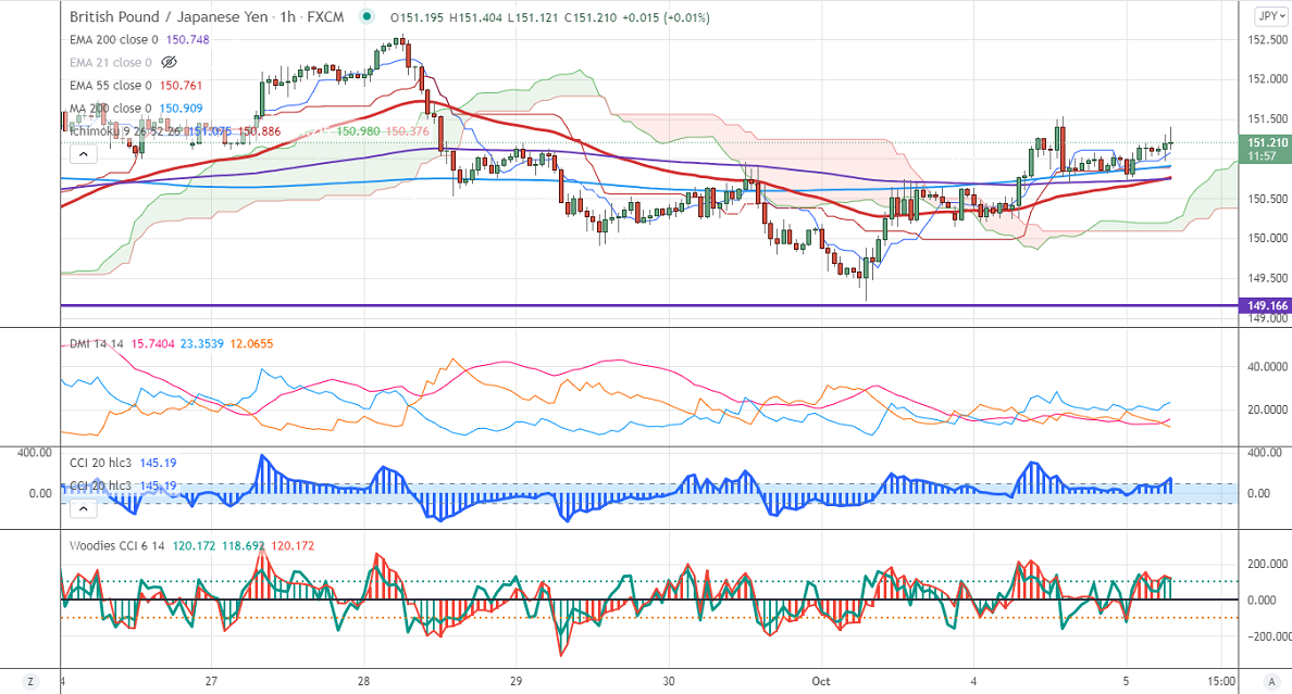 GBPJPY has taken support near 200-H EMA and shown a nice recovery on a minor pullback in Pound sterling. The petrol shortage and Brexit concerns are preventing the pound sterling from further upside. GBPJPY hits an intraday high of 151.40 and is currently trading around 151.273.
