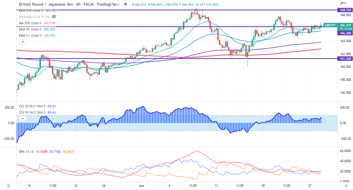 GBPJPY is trading in a narrow range between 165.13 and 166.48 for the past two days. The pound sterling trades lower despite the weak US dollar. Any breach below 1.2235 confirms a bearish continuation. Technically in the 4-hour chart, the pair is holding above 21-EMA, above 55 EMA, and long-term 200 EMA (163.73). Any break below 165.70 will drag the pair down to 165/164.60/163. GBPJPY hits an intraday high of 166.33 and is currently trading around 166.475.