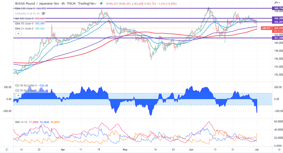 GBPJPY lost more than 100 pips in today's Asian session on a strong yen. The minor sell in pound sterling from yesterday's high of 1.21880 after BOE Governor's cautious tone in ECB annual forum. Any close below 1.2100 confirms a bearish continuation. Technically in the 4-hour chart, the pair is holding below 21-EMA, 55 EMA, and above long-term 200 EMA (164.05). Any break below 163.60 will drag the pair down to 163/160. GBPJPY hits an intraday low of 163.72 and is currently trading around 163.72.
