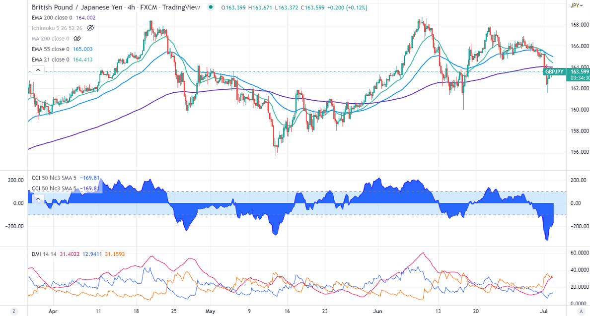 GBPJPY showed a minor pullback of more than 150 pips from its Friday's low of 161.56. The pound sterling declined nearly 200 pips on Friday to a company survey report. According to the British Chambers of commerce, 54% of companies expected turnover to increase in 12 months compared to 63%. Any daily close below 1.2000 confirms a bearish continuation. Technically in the 4-hour chart, the pair is holding below 21-EMA, above 55 EMA, and long-term 200 EMA (164). Any break below 163 will drag the pair down to 161.50/160. GBPJPY hits an intraday high of 163.66 and is currently trading around 163.658.