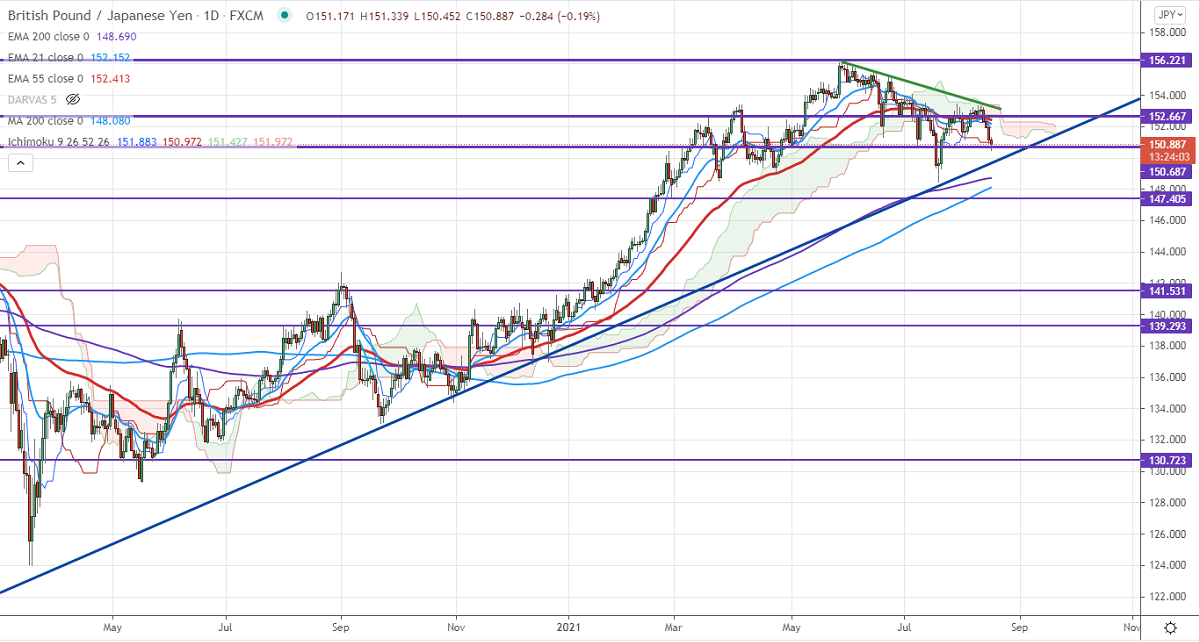 GBPJPY lost more than 250 pips after forming a minor top around 153.29. The pound sterling is trading below 1.3800 levels against the US dollar despite upbeat UK jobs data. The Claimant count rate declined to 5.7% in July from the previous 5.8%. The surge in Japanese yen due to the spread of the delta variant has increased demand for safe-haven assets. The intraday trend of GBPJPY is bearish as long as resistance 151.55 holds.