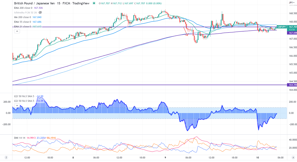GBPJPY has formed almost a triple top around 168.60-72 and showed a minor sell. Technically in 15 min chart, the pair is holding below short term (21- and 55 EMA) and 200 MA (167.83). Any break below 167.30 will drag the pair down to 166.69/165.80. GBPJPY hits an intraday low of 167.49 and is currently trading around 167.496.
