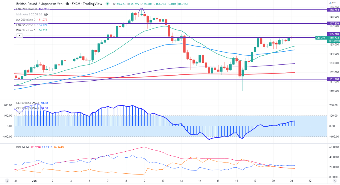 GBPJPY trades in a narrow range in Asian sessions between 165.86 and 165.61. Technically in the hourly chart, the pair is holding above short term (21- and 55 EMA) and 200 MA (167.37). Any break below 164.35 will drag the pair down to 162.90/161.85/160. GBPJPY hits an intraday high of 165.87 and is currently trading around 165.76.