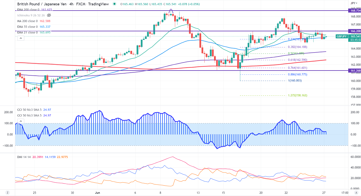 GBPJPY is trading flat after a minor sell-off the previous week. The pound sterling trades higher after upbeat UK CPI data. It hits a 40-year high at 9.1% in line with estimate, slightly higher than the previous month's 9%. Technically in the 4-hour chart, the pair is holding below 21-EMA, above 55 EMA, and long-term 200 EMA (163.60). Any break below 164.60 will drag the pair down to 163.67/162.65. GBPJPY hits an intraday high of 165.72 and is currently trading around 165.52.