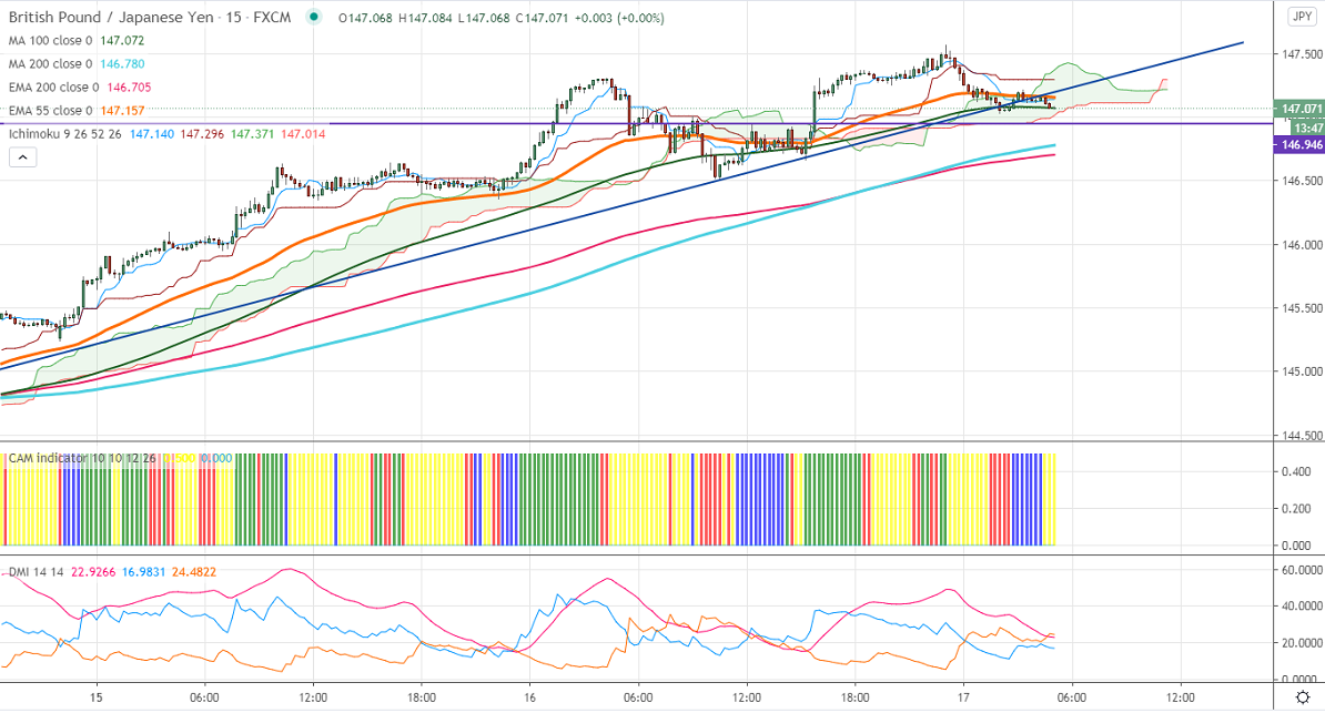 The pair's significant resistance at 147.95, any convincing break above confirms bullish continuation. A jump till 150/151.20 possible. On the lower side, near-term support is around 146.70 (200- 15 min MA). An indicative break below will drag the pair down till 146/145.80/145/144. Significant trend reversal only below 144. A violation below will drag the pair to 142.80.