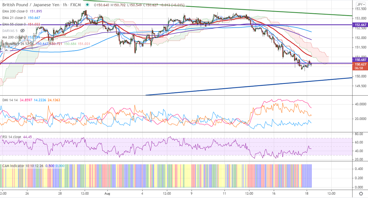 GBPJPY was one of the worst performers this week and lost more than 100 pips on the weak Pound sterling. GBPUSD is inching towards 1.3700 levels after UK CPI misses the estimate. The annualized inflation came at 1.8% in July compared to a forecast of 2%. The Japanese yen has taken support near multi-month low 109 and bounced above 109.50. The intraday trend of GBPJPY is bearish as long as resistance 151.55 holds.
