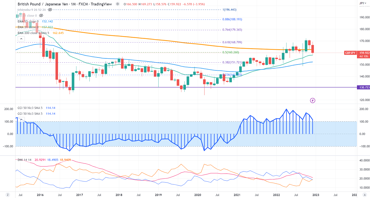 GBPJPY traded lower for the second consecutive month and lost more than 1100 pips from a minor top of 172.12 on the strong yen. It hits a low of 158.57 and is currently trading around 159.92.