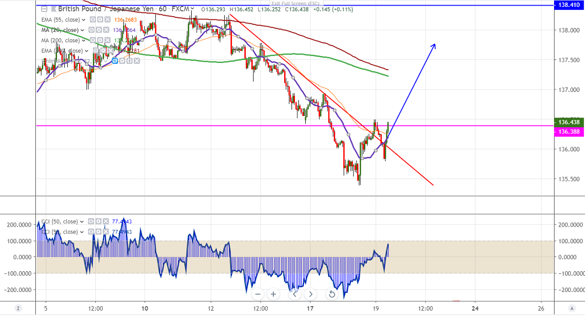 GBPJPY recovered more than 100 pips after a 1- week of weakness. It has lost more than 250 pips from high of 138.32 made on Jun 11th, 2019. The decline was mainly due to Brexit uncertainty. The pair hits multi-month low at 135.38 yesterday and is currently trading around 136.40.