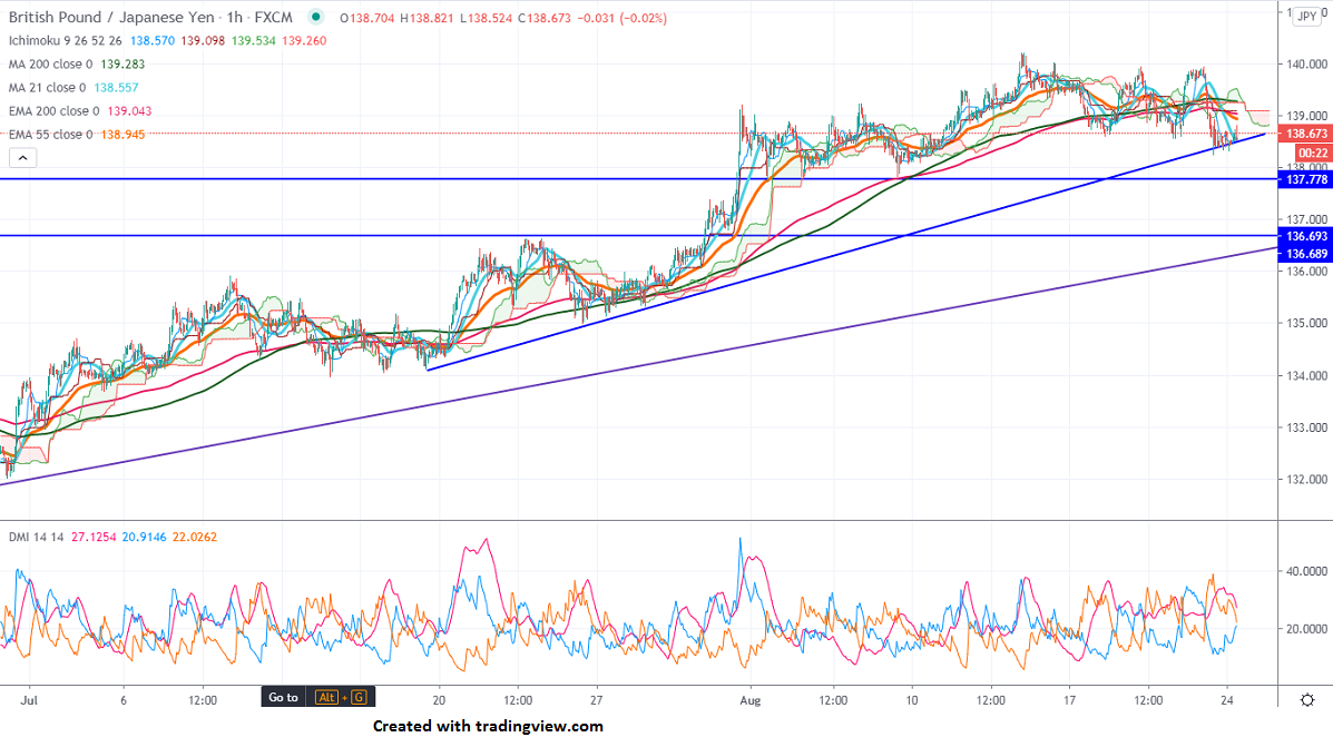 The hourly chart shows that the pair is holding below 200 MA. Any break above 139.28 will drag the pair till 140.20/141/141.80. The near term resistance is around 138.20, any break below targets 137.40/136.60.