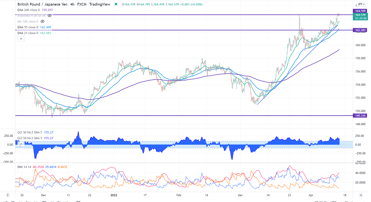 GBPJPY hits 2-1/2 weeks high on surging pound sterling. It gained sharply against USD on upbeat UK CPI data. The annual inflation rate rose to 7% in Mar compared to 6.2% in Feb, its highest in 30 years. Any close above 1.3200 confirms further bullishness. GBPJPY hits an intraday high of 163.84 and is currently trading around 163.40.