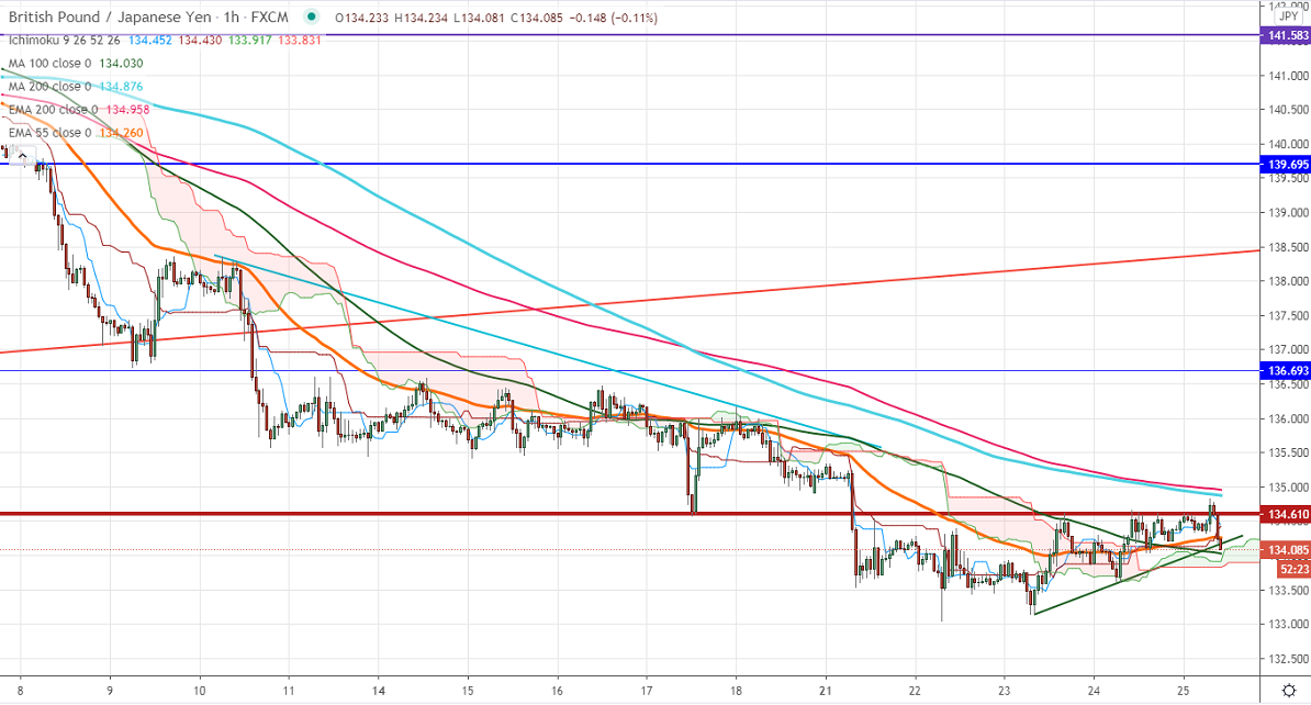 GBPJPY has shown a nice jump till 134.82 on a slight surge in Pound sterling. GBPUSD crossed 1.2800 level after UK FM announced more job protection plans and optimism on the Brexit deal. But strong US dollar has dragged the pound sterling well below 1.2750 level. The overall trend of GBPJPY is weak as long as resistance 135 holds.