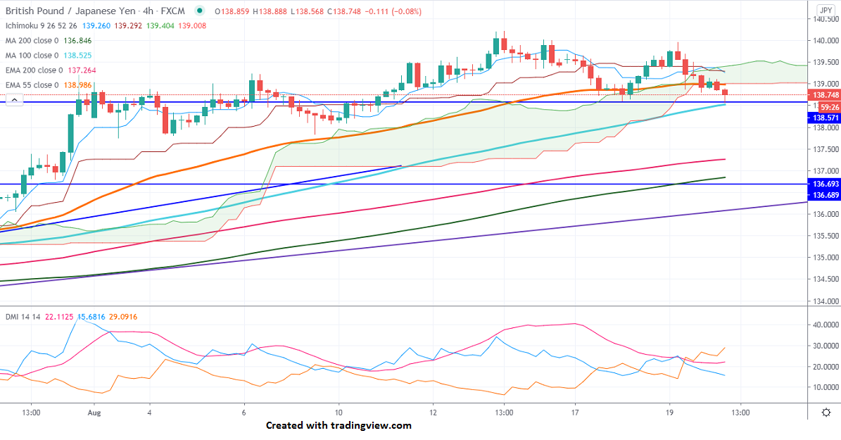 The 4-hour chart shows that the pair is holding below Tenken-Sen and Kijun-Sen, any break below 138.50 (100-4H MA) will drag the pair down till 137.40/136.60. The near term resistance is around 140.20, any break above targets 141.10/142.