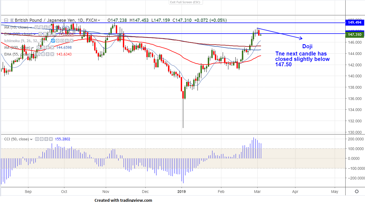 GBPJPY hits low of 147.10 and shown a minor recovery.The near term support is around 146.98 and violation below will drag the pair to next level till 146.10 (10- day MA) and has formed doji in daily chart and bearish confirmation happens only if it trades below 147.50 and any break below will drag the pair till 146.83 (23.6% fib)/146.16/145.30 (300- day EMA).