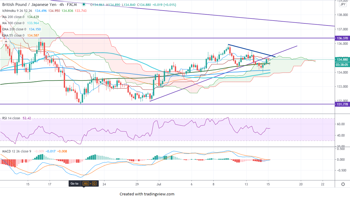 The 4-hour chart shows that the pair is trading above 100 and 200 MA (133.94 and 134.62). The near term support is around 133.90, and the indicative break below that level will drag the pair to the next level 133/131.75.