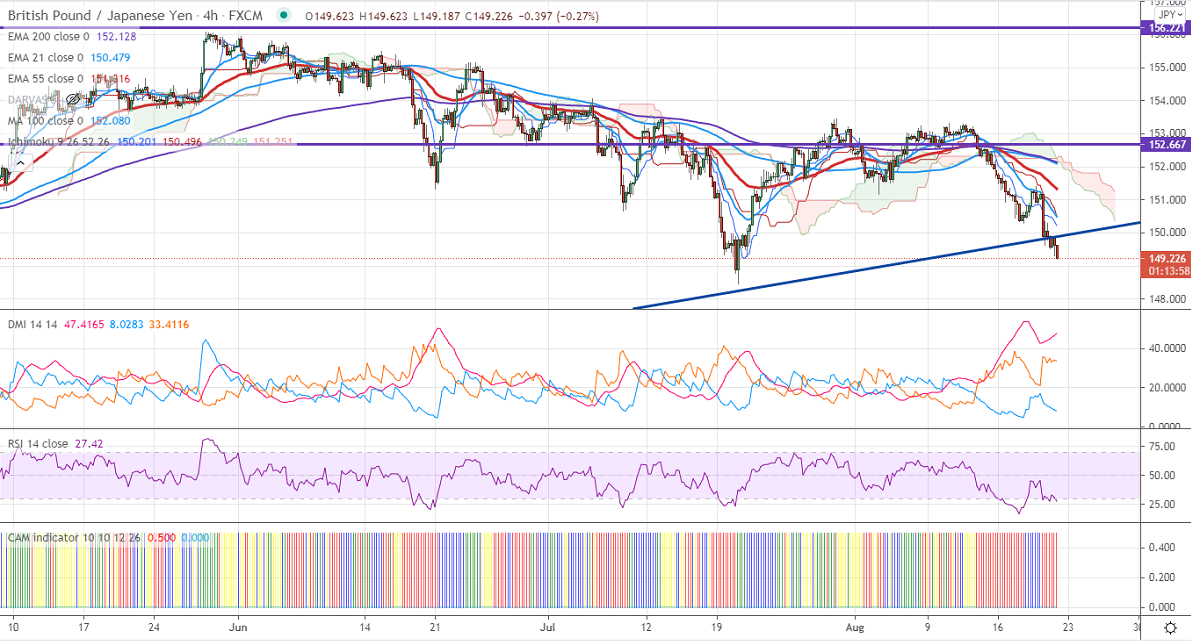 GBPJPY has broken significant trend line support and holding well below that level. The pound sterling inching towards 1.3600 after dismal UK retail sales data. It has dropped by -2.5% in July compared to a forecast of 0.2%. The intraday trend of GBPJPY is bearish as long as resistance 150.60 holds.