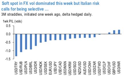 European political risk and quarter end spot moves increase risk of realized vol comeback, though to us the backdrop remains supportive of the last week’s vol shorts in EURPLN and USDIDR when we highlighted EM vol to have had peaked. Courtesy: JPM