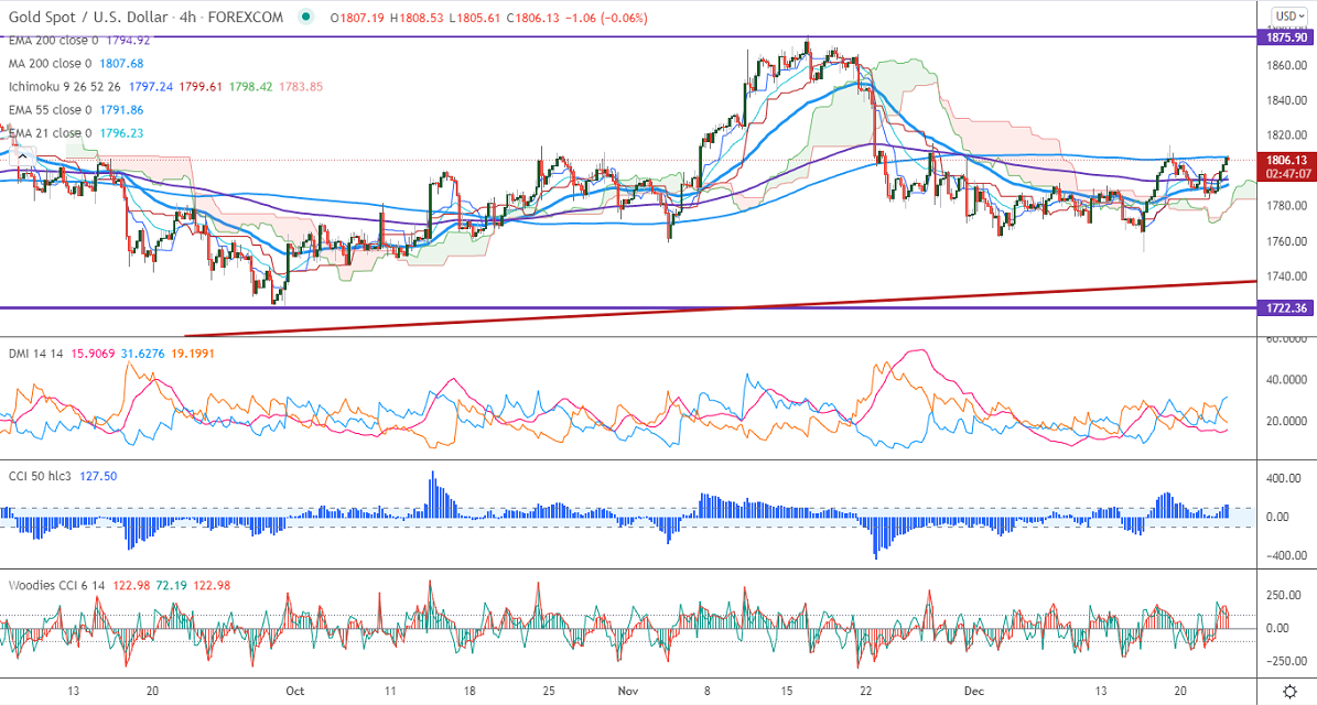 Gold recovered above $1800 after hitting a low of $1784 level on dollar weakness. The spread of omicron across the globe also supports yellow metal at lower levels. The US dollar index almost formed a double top around 96.65 and showed a decline of more than 50 pips. US economy expanded at an annual pace of 2.3% compared to a forecast of 2.1%. US Consumer confidence rose in Dec to 115.8 in Dec vs estimate 111. It hits an intraday high of $1808.50 and is currently trading around $1806.55.