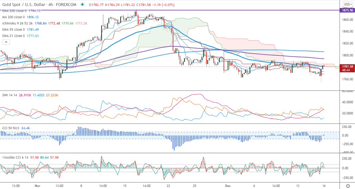 Gold is trading weak after Fed monetary policy. The central bank has kept its rate unchanged and doubled the size of tapering from $15 billion per month to $30 billion per month. Almost two-thirds of Fed members have projected two to three rate hikes in 2022. The yellow metal declined to $1753 and is currently trading around $1781.56. US dollar index holds above 96.50 levels, any breach above 97 confirms bullish continuation.