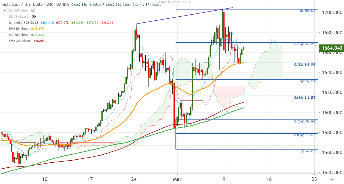 Gold is trading weak and lost nearly $40 yesterday as risk appetite slightly improved. US markets surged nearly 5% with Dow Jones 25018 (4.89%) ,S&P500 2882 (4.94%) and Nasdaq 8344 (4.94%) higher. The demand for precious metals is expected to rise due to the outbreak of coronavirus and rate cut by major central banks. It hits a low of $1641.718 and is currently trading around $1657.38.