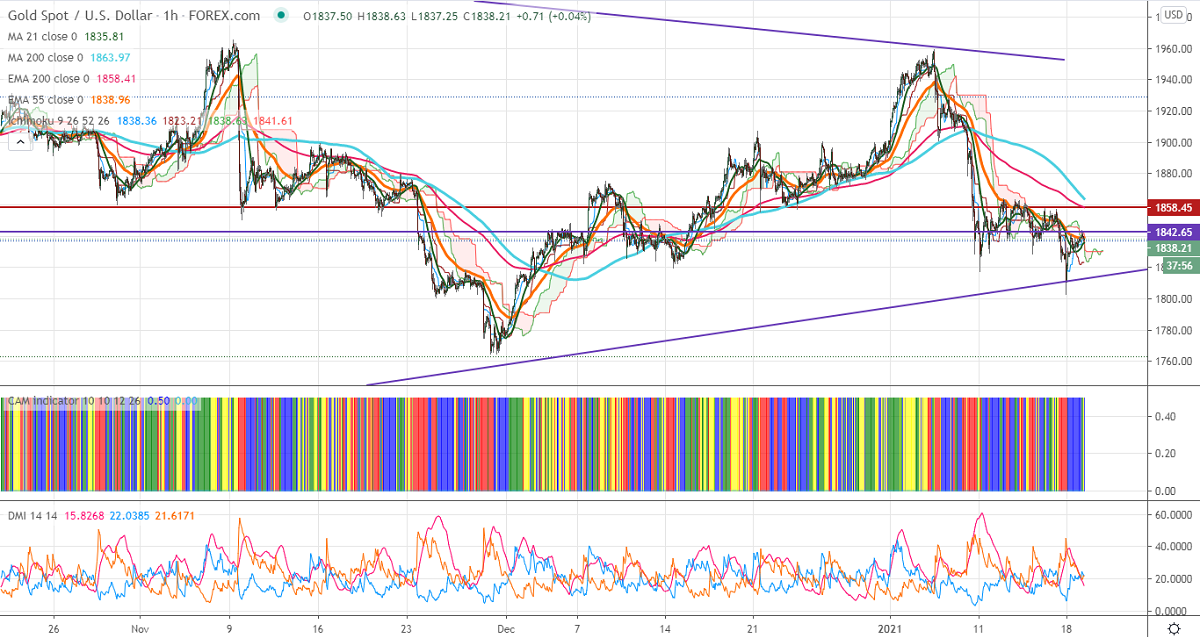 Gold has taken support near $1800 and shown a minor recovery till $1843. The slight weakness in the US dollar index and dip in US 10-year yield is supporting the yellow metal at lower levels. The minor trend reversal can happen if it breaks above $1865 (200-H MA). US dollar index's significant bullishness only if it breaks 91 levels.