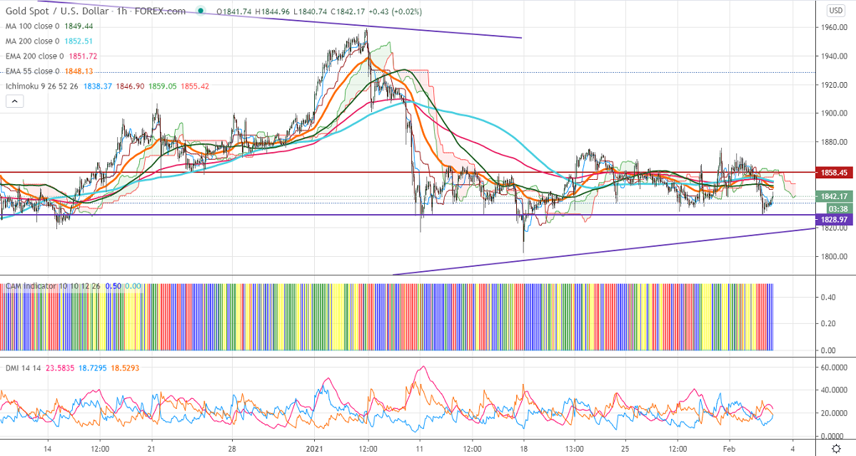 Gold has formed a triple bottom around $1831 in the hourly chart and shown a minor recovery. The yellow metal lost more than $30 on strong US dollar. DXY breaks significant resistance 91 levels after a long consolidation. The surge in US 10-year yield is also putting pressure on gold at higher levels. Markets eye US ADP employment and US ISM services PMI data for further direction.