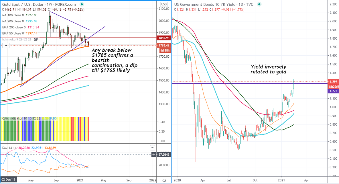 Gold took support near 55- day EMA and shown a minor recovery. The surge in US bond yield is putting pressure on the yellow metal at higher levels. The US 10- year yield jumped more than 8% yesterday, the biggest daily rally in three months. The US market hits record high on upbeat market sentiment also dragging the gold prices lower. The short-term trend is bearish as long as resistance $1860 holds. The US recovered slightly, any surge past 91 confirms a bullish continuation.