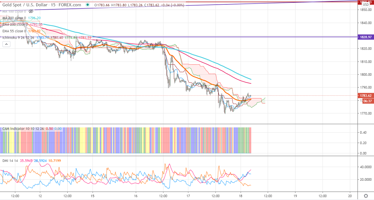 The yellow metal is facing significant resistance at $1796-$1800 (200-15 min MA), any indicative break above targets $1820. It is facing strong support at $1765. Any violation below that level confirms minor bearishness, a dip till $1717/$1690likely.