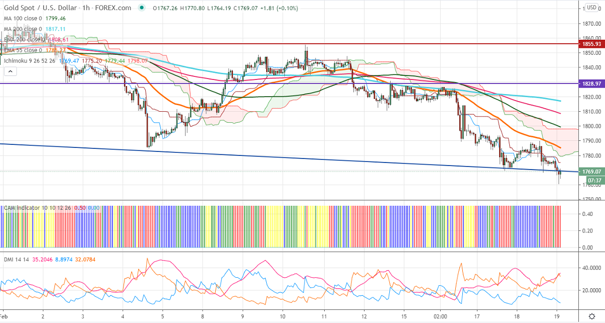 Gold continues to trade lower and hits 10- week low on surging US 10-year yield. The yield slipped slightly from a multi-year high despite positive US retail sales. The US dollar index lost nearly 50 pips from a high of 91.05 on weak US economic data. The number of people who have filed for unemployment benefits rose to 861000 in the week ended Feb 13 compared to a forecast of 775K. US building permits rose by 10% while housing starts plunged by 6%. The short-term trend is bearish as long as resistance $1800 holds.