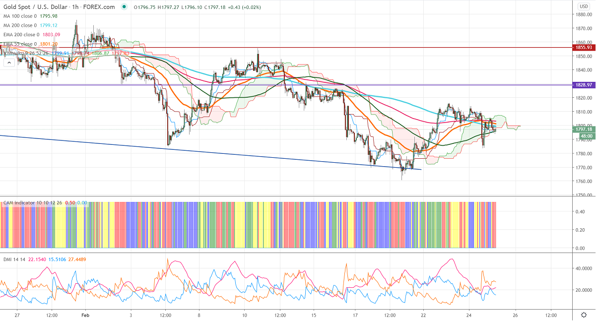 Gold is trading below the $1800 level on weak yen and surging US bond yield. The bond yield is rising as extended stimulus might increase inflation. The US dollar index continues to trade weak, violation below 89.90 confirms bearish continuation. US new home sales surged sharply and hits 3 months high. It came at a 923000 annualized pace in Jan compared to a forecast of 856000. Market eyes US Prelim GDP and durable goods orders for further direction.