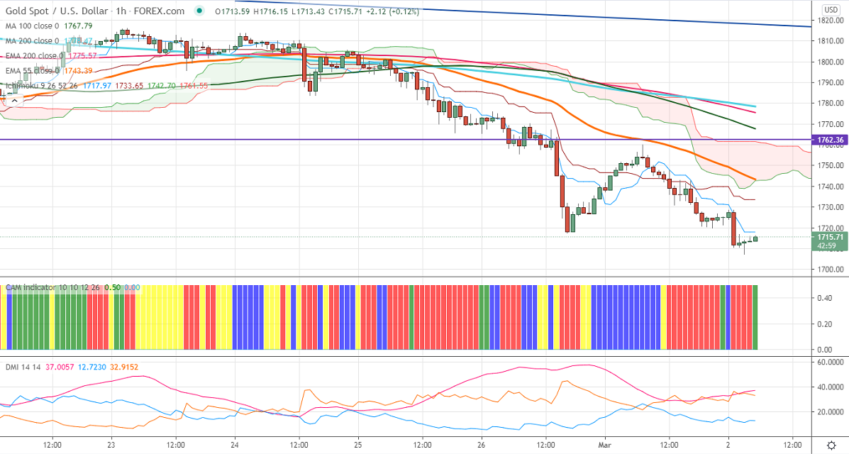 Gold is trading weak for the fourth consecutive day and lost more than $100 on surging US bond yield and strong US dollar index. The US 10- year yield lost more than 10% after hitting a multi-year high of 1.56%. The US dollar index is holding well above 91 levels, any violation above 91.60 targets 92.50.