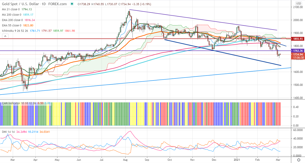 Gold is consolidating after hitting a multi-month low of around $1707. The vaccine optimism and hopes of more fiscal stimulus have decreased the demand for safe-haven assets. The US 10- year yield declined after hitting a multi-month high. US dollar index halted its four days of the bullish trend and lost more than 50 pips.