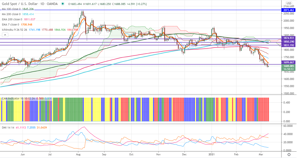 It is facing strong resistance at $1715 (7- day EMA), violation above targets $1745/$1760$1645 (161.8%)/$1637. On the higher side, near-term support is around $1675, any indicative break below that level will take the pair to $1650/$1637.