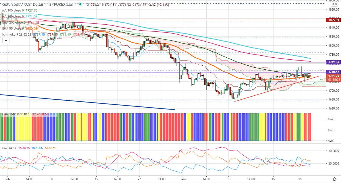 Gold has shown a fake breakout above the trend line and declined sharply from that level. The surge in US bond yield is putting pressure on the yellow metal. The 10- year bond yield hits a 13-month high at 1.744% despite dovish comments by Fed. DXY rose more than 50 pips from the minor bottom around 91.30. The vaccine rollout and positive global economic recovery are putting pressure on gold at higher levels.