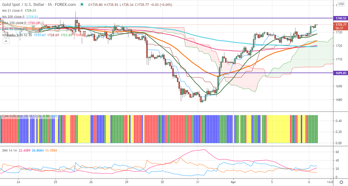 Gold is trading higher and holding well above $1700 on dollar weakness. The US dollar index has lost more than 90 pips for a high of 93.43. The minor profit booking in US bond yield is also supporting the yellow metal. US 10-year yield declined more than 3% from yesterday's high 1.745%.