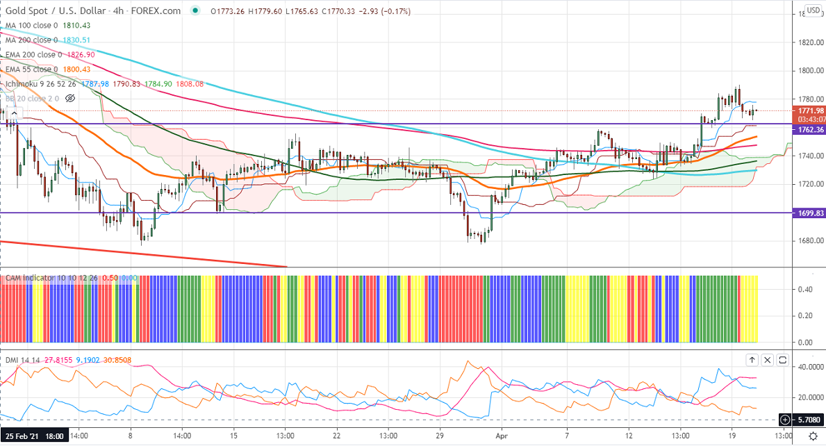 Gold is trading slightly lower after hitting a high of $1790 on a minor pullback in US bond yields. The weakness in the US dollar index is putting pressure on this yellow metal. DXY breaks significant support 91 levels, a dip till 90.60 likely. The upbeat market mood due to fast coronavirus vaccination is preventing gold from further upside. US 10-year yield surged more than 5.5% from a minor low of 1.53%.