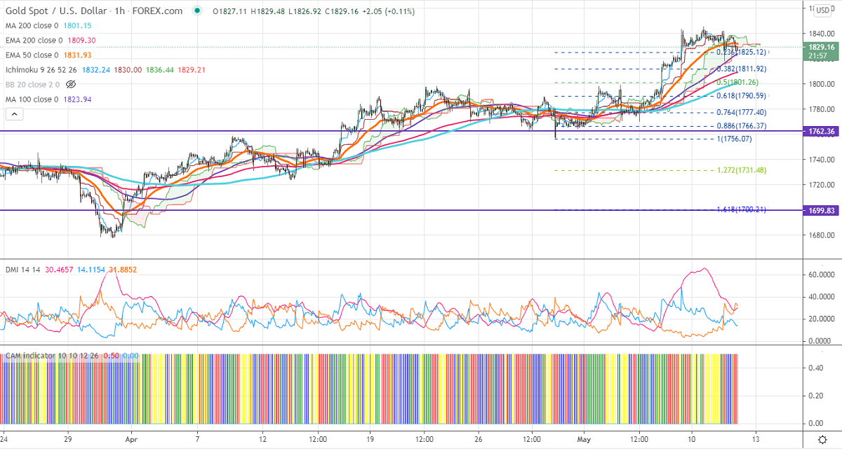 Gold is trading slightly lower after hitting a high of $1845. The slight pullback in US bond yield is putting pressure on the yellow metal at a higher level. DXY jumped more than 40 pips from a minor bottom at 89.98. Markets eye US CPI data which is to be released today for further direction. The surge in the number of new coronavirus cases in major countries has increased demand for safe-haven assets. The US 10-year bond yield surged more than 10% from minor bottom 1.48%. The yellow metal hits a high of $1826 and is currently trading around $1829.