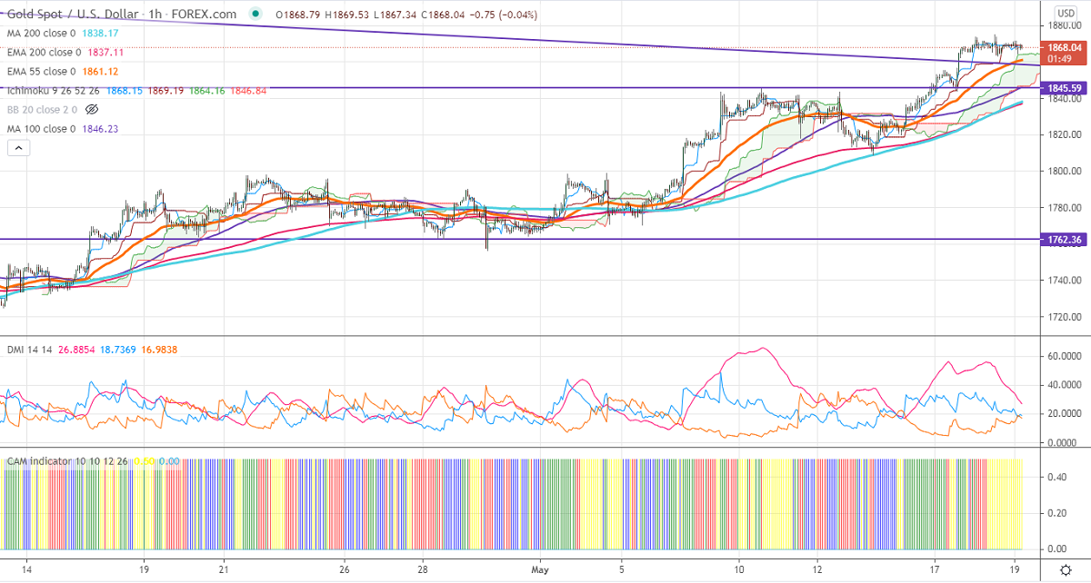 It is facing strong support at $1860, violation below targets $1850/$1845/$1838. Significant trend continuation only below $1675. On the higher side, near-term resistance is around $1875, any convincing break above confirms bullish continuation. A jump to $1900/$1932 is possible.