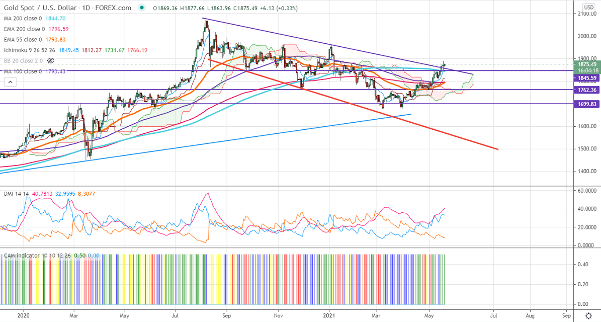 Gold declined nearly $30 post FOMC minutes. The minutes for the FOMC meeting in Apr showed that some of the members are slightly hawkish and discussed QE tapering. "A number of participants suggested that if the economy continued to make rapid progress toward the Committee's goals, it might be appropriate at some point in upcoming meetings to begin discussing a plan for adjusting the pace of asset purchases," the minutes said. The dollar index jumped more than 50 pips from the minor bottom 89.69. The yellow metal hits an intraday high of $1877 and is currently trading around $1875.42.