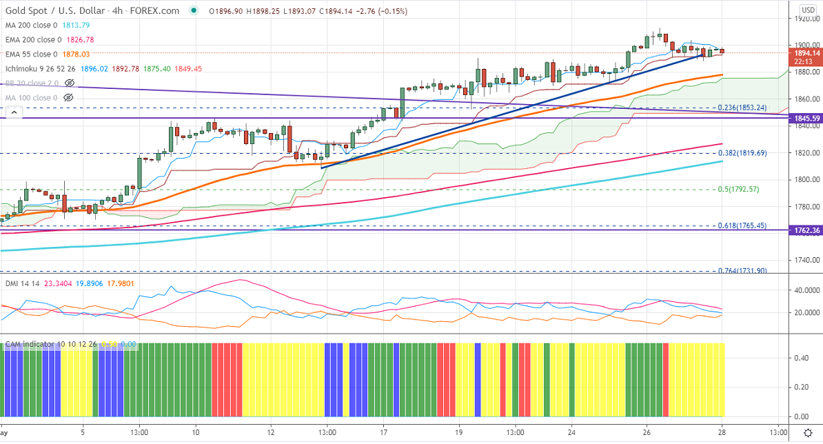 Gold is consolidating after hitting a multi-month high of $1912.80. DXY recovered from a low of 89.53 and holding above 90 levels. Any jump above 90.30 confirms a bullish continuation. The Biden is expected to propose a $6 trillion budget that will boost education, infrastructure, and healthcare The US first-quarter GDP came unchanged at 6.4% slightly less than the forecast of 6.5%. US Durable goods orders declined by 1.3% weaker than the estimated 0.8%. The number of people who have filed for unemployment benefits dropped to 406000 last week. The US 10-year bond yield surged more than 2% from the recent low of 1.552%. The yellow metal hits an intraday high of $1898.65 and is currently trading around $1894.19.