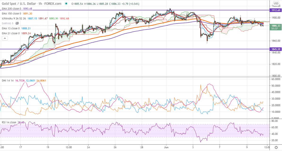 Gold is trading in a narrow range between $1916 and $1859 for the past week despite weak US bond yields. With no further buying momentum, markets eye US CPI data for further direction. The US 10-year bond yield hits a five-week low and trading below 1.50%. The US dollar index is holding well above 90 levels. A jump till 90.60 is possible. Gold hits an intraday high of $1884 and is currently trading around $1886.19.