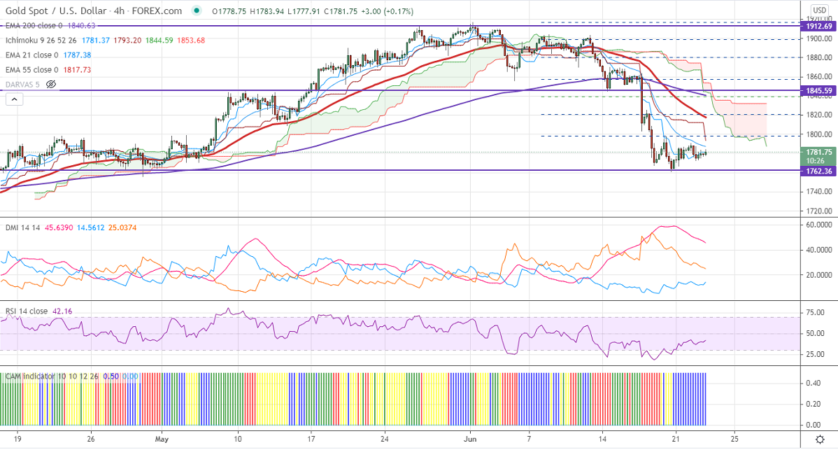 Gold recovered slightly after a major sell-off to $1764. The yellow metal was one of the worst performers and the previous week on strong US dollar. The overall trend is weak as long as resistance $1916 holds. The US dollar index is struggling to close above 92 levels. Any breach above 92.50 confirms a bullish continuation. The slight pullback of more than 10% in US 10-year bond yield is putting pressure on the yellow metal. Gold hits an intraday high of $1782 and is currently trading around $1781. Markets eye flash manufacturing PMI data for further direction.