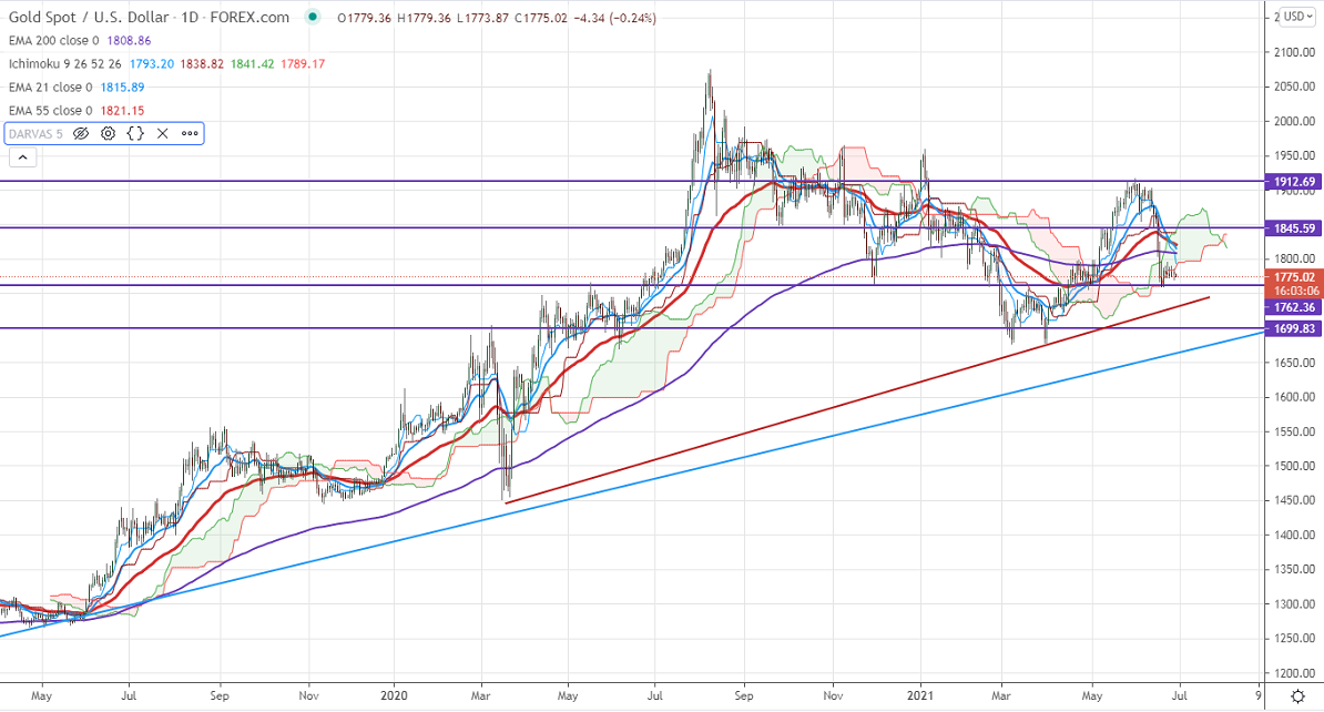 Gold is consolidating in a narrow range of $1795 and $1770 for the past five days. The minor pullback in the US dollar is putting pressure on the yellow metal at higher levels. The decline in US 10-year bond yield also a factor preventing further upside. With no primary economic data in focus, markets eye US nonfarm payroll data on Friday for further upside.US dollar index should close above92 levels for further up move. Gold hits an intraday low of $1773.87 and is currently trading around $1774.86