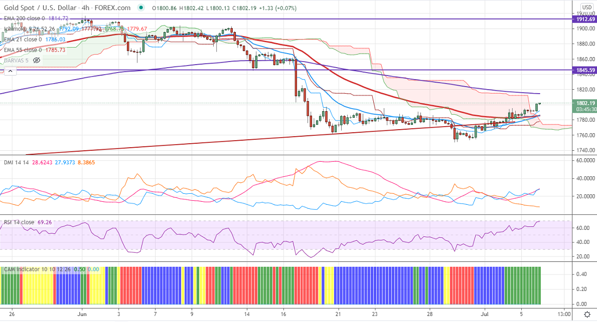 Gold recovered sharply more than $50 and hits a 3-week high on the softer dollar. Markets eye US ISM services data for further direction. DXY continues to trade weak for the past three days and holding above 92. Any breach below 92 confirms intraday weakness. The US 10- year yield rose by two basis points from the previous week's low of 1.4270. It hits an intraday high of $1799.99 and is currently trading around $1799.24.