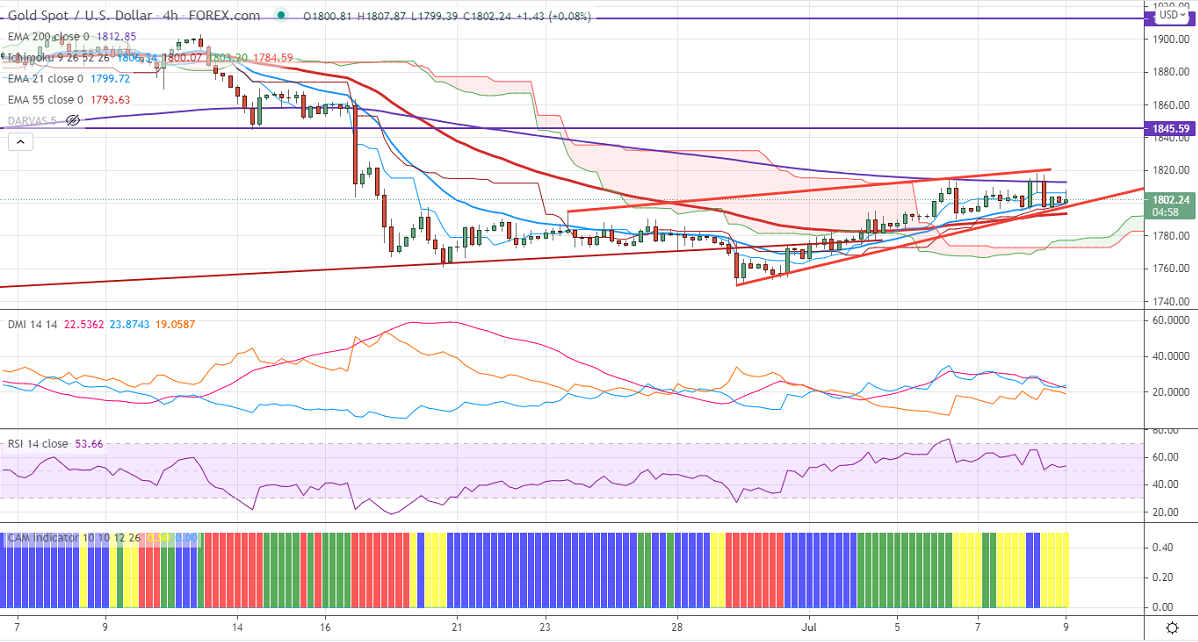 Gold is trading highly volatile for the past two days and struggling to hold above $1800 levels. The dip in US yield countered surge in US dollar is protecting the yellow metal major selling. The spread of the Coronavirus in major parts of the world has increased the demand for safe-haven assets. The rise in the number of new cases in the US, the UK due to delta variant is the cause of concern. The US 10- year yield has halted its four-month and shown a minor jump of more than 7%. The yellow metal hits a high of $1805 yesterday and is currently trading around $1796.94.