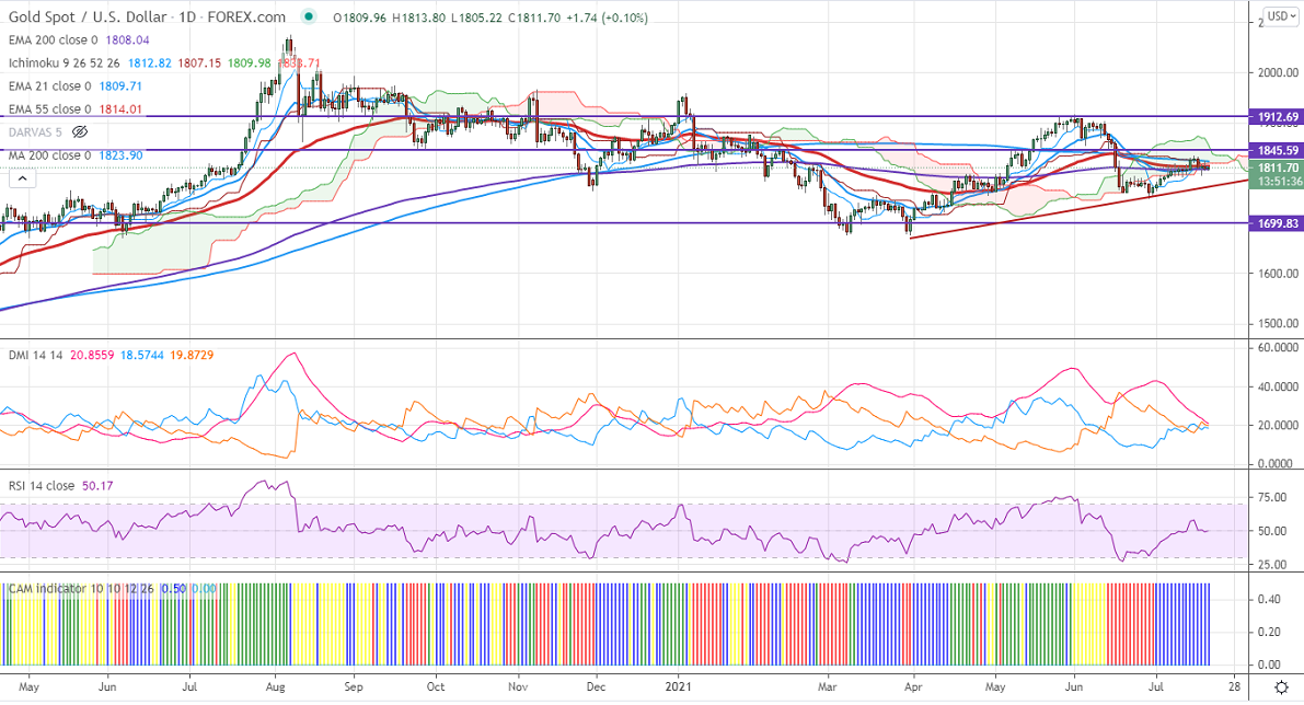 Gold rally fades after a minor pullback in US bond yields. The yellow metal lost more than $20 from a temporary top of $1825. It is holding well above $1800 as the spread of delta variant coronavirus has increased demand for safe-haven assets. Gold hits an intraday high of $1813.80 and is currently trading around $1812.32.