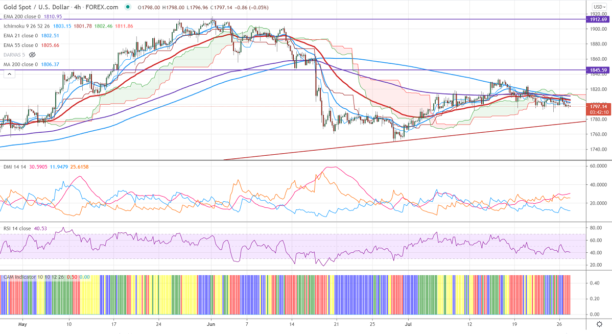 Gold pared some of its gains n the US session despite the weak US dollar. The US dollar has shown a minor sell-off after forming a temporary top around 93.19. Markets eye US Fed monetary policy tomorrow for further direction. The yellow metal has an intraday high of $1807 and is currently trading around $1806.10.