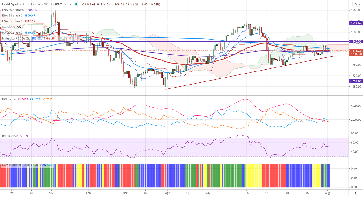 Gold is trading in a narrow range after hitting a high of $1831. The declining bond yields are preventing the yellow metal from further decline. The US 10-year yield slipped below 1.15%, the lowest level since Feb 2021. The US dollar index showed minor weakness after US ISM data. It came at 59.5 in Jul compared to a forecast of 60.8. The yellow metal hits an intraday low of $1809.71 and is currently trading around $1812.20. The spread of delta variants across has increased demand fr safe-haven assets.