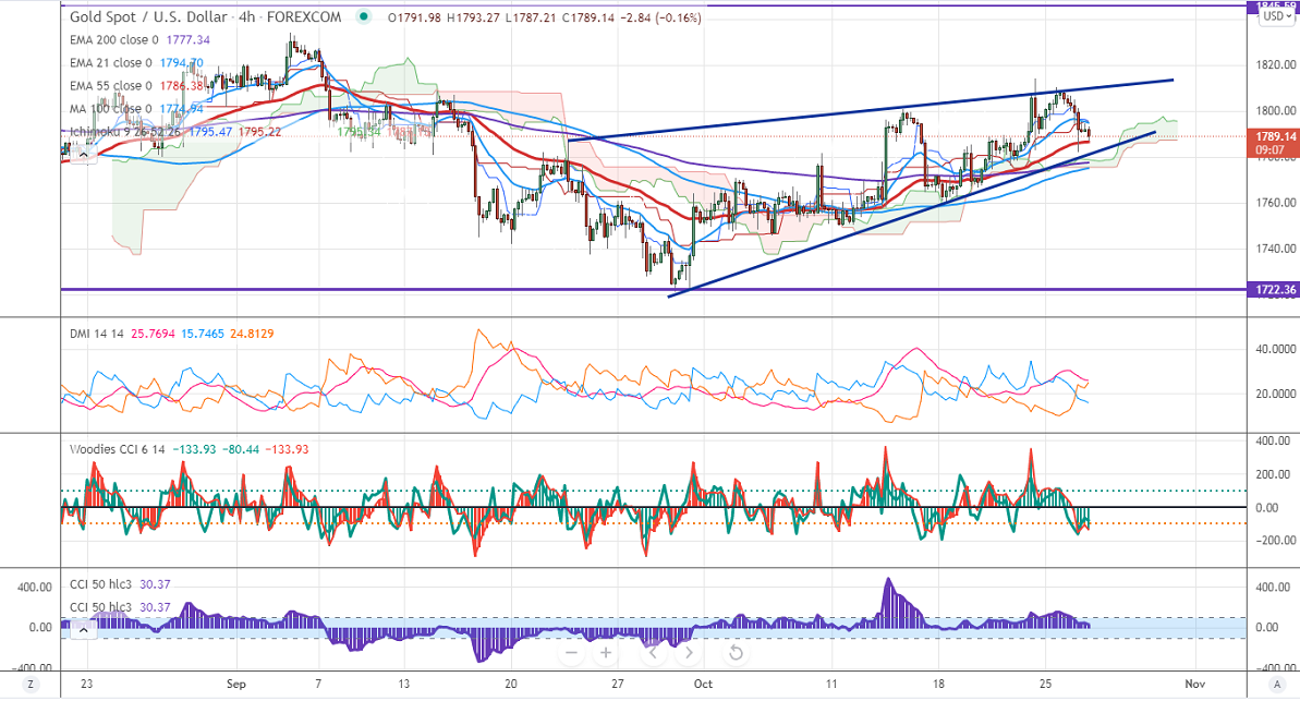 Gold halted its five days of a winning streak and lost more than $20 from a high of $1813. The pullback in the US dollar is preventing the yellow metal from further upside. The US dollar index consolidated in a narrow range between 93.484 and 94.02 for the past four days. Any weekly close above 94.20 confirms bullish continuation.US CB consumer confidence rebounds in Oct to 113.80 compared to forecast of 108.40. While Richmond's manufacturing index rose from -3 to 12. Gold hits a low of $1782.47 and is currently trading around $1789.06.